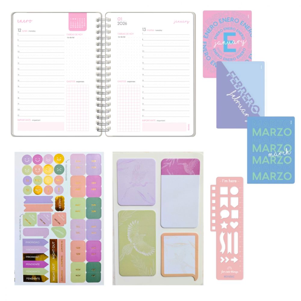 • Incluye sticky notes, stickers, bookmark y bolsa individual