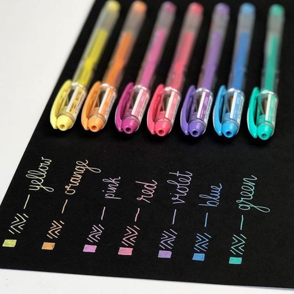 - Bolígrafo gel de tinta glitter altamente brillante que resalta fácilmente sobre papeles oscuros.