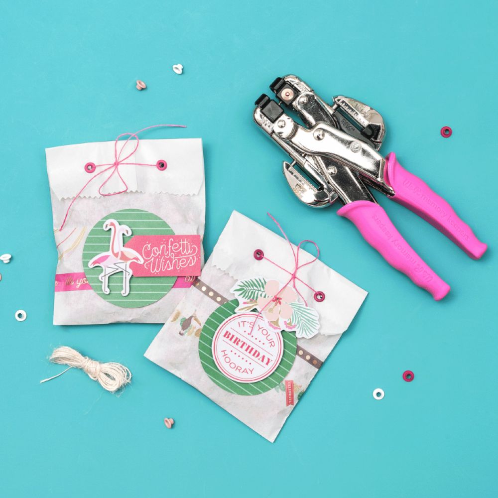 Bs. 640.00El original Crop-A-Dile Punch de We R Memory Makers es una herramienta todo en uno fácil de usar que perfora agujeros de 1/8 y 3/16 pulgadas a través de papel, cuero, plástico, metal, aglomerado, acrílico, tela, madera y mucho más. También es una excelente herramienta de configuración que puede usar con ojales, broches y otros adornos. La función de medición deslizante hace que el espacio entre agujeros y la colocación de ojales sea fácil y preciso. Una manija de confort rosa fácil de agarrar permite una operación sin esfuerzo sin fatiga de la mano. El sistema de bloqueo de la manija hace que el Crop-A-Dile sea tan fácil de almacenar en el estuche de transporte de plástico resistente incluido.
