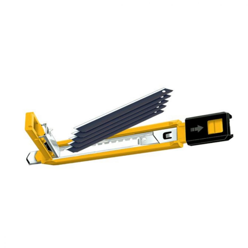 Esta revolucionaria navaja de varias hojas satisface fácilmente las necesidades de cambio continuo de hoja con función de carga automática de hoja. Admite hasta 5 hojas, es decir, 65 nuevos segmentos de corte por carga, todos almacenados en un mango elegante y cómodo para una máxima productividad en el lugar de trabajo. Cuenta con un bloqueo automático de la hoja y está equipado con una hoja ExcelBlack. Cambio de hoja fácil y sin herramientas para mayor comodidad.