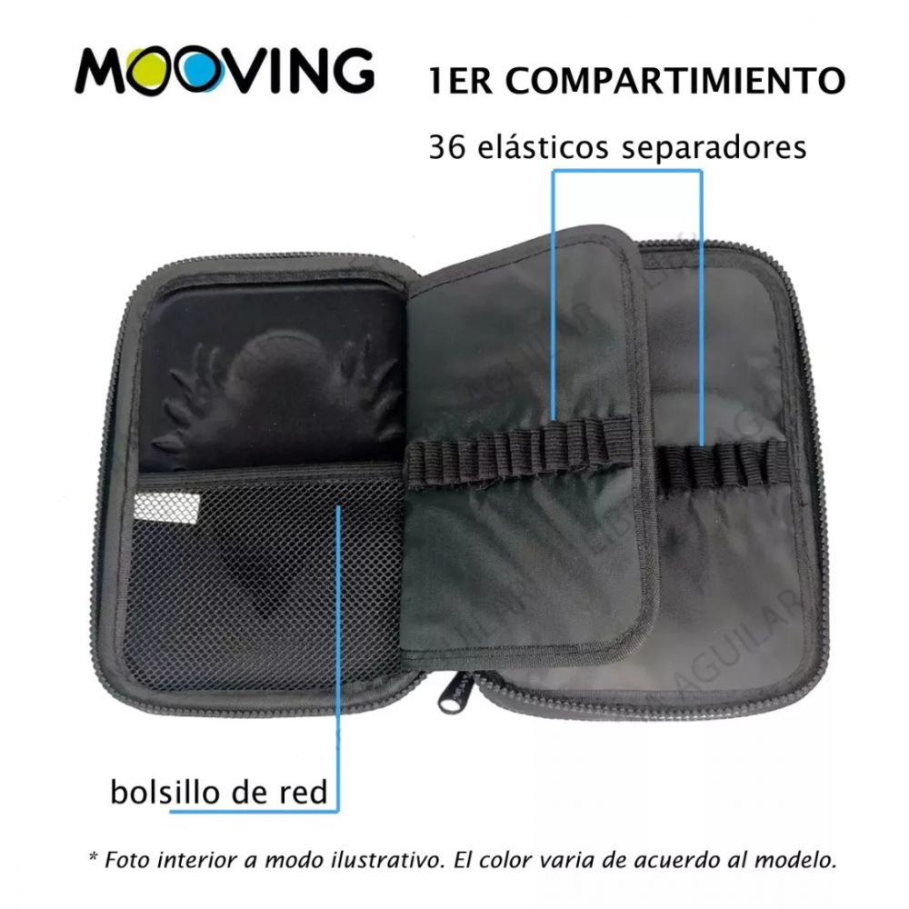 - 1° Compartimiento, Bolsillo de red, 1 solapa con 24 elásticos para útiles y 12 elásticos en el medio.