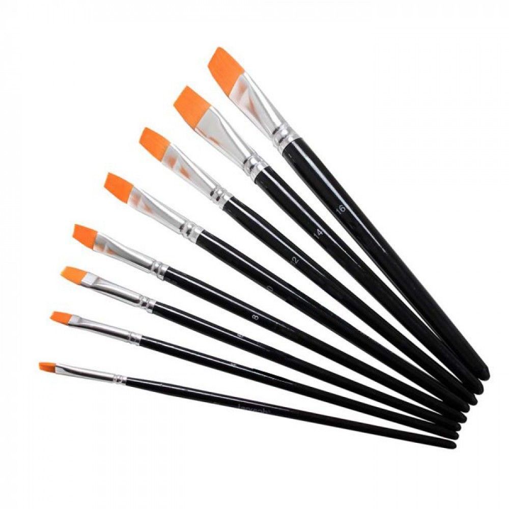 - Juego de pinceles con mangos de madera color negro y férulas de color plateado.