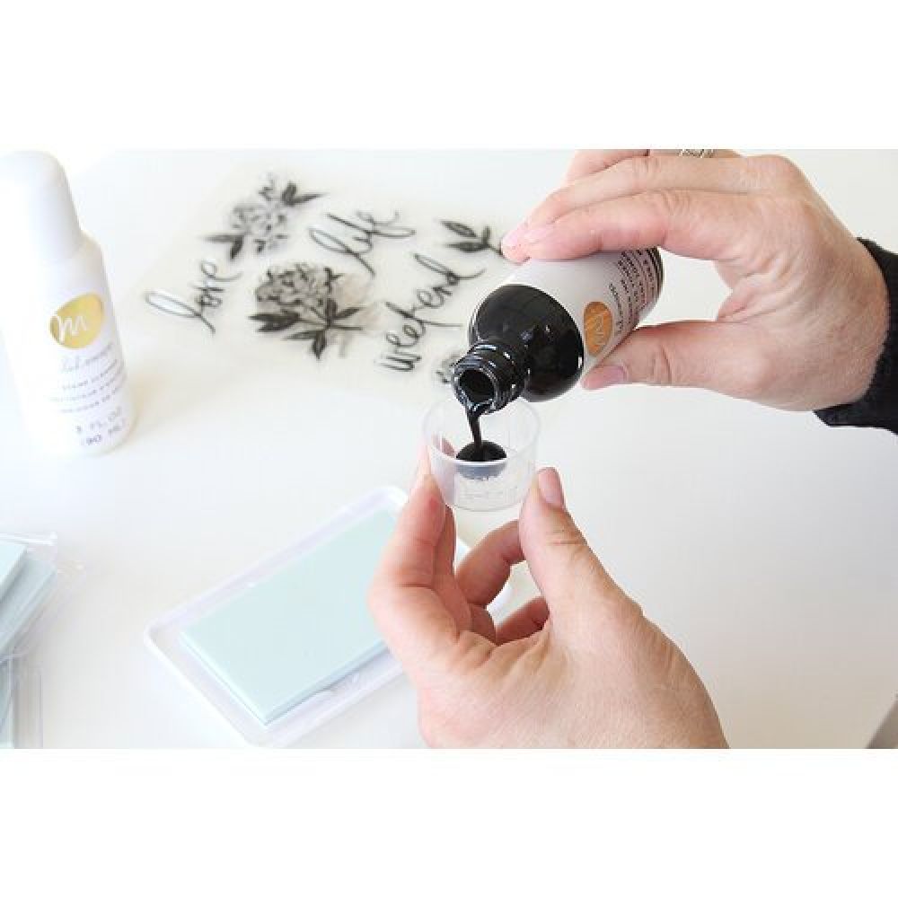 - Con la taza medidora incluida, vierta 15 ml de tinta de tóner en la almohadilla de sello. Deje reposar durante 15-30 minutos antes de comenzar a estampar para que la tinta del tóner se vuelva ligeramente pegajosa.