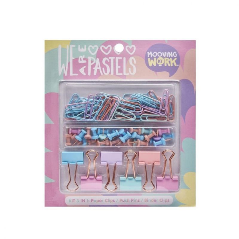 Todo lo que necesitas en tu escritorio en este set mooving. Contiene: 90 clips de 33 mm / 30 push pins / 6 clips dobles de 25 mm