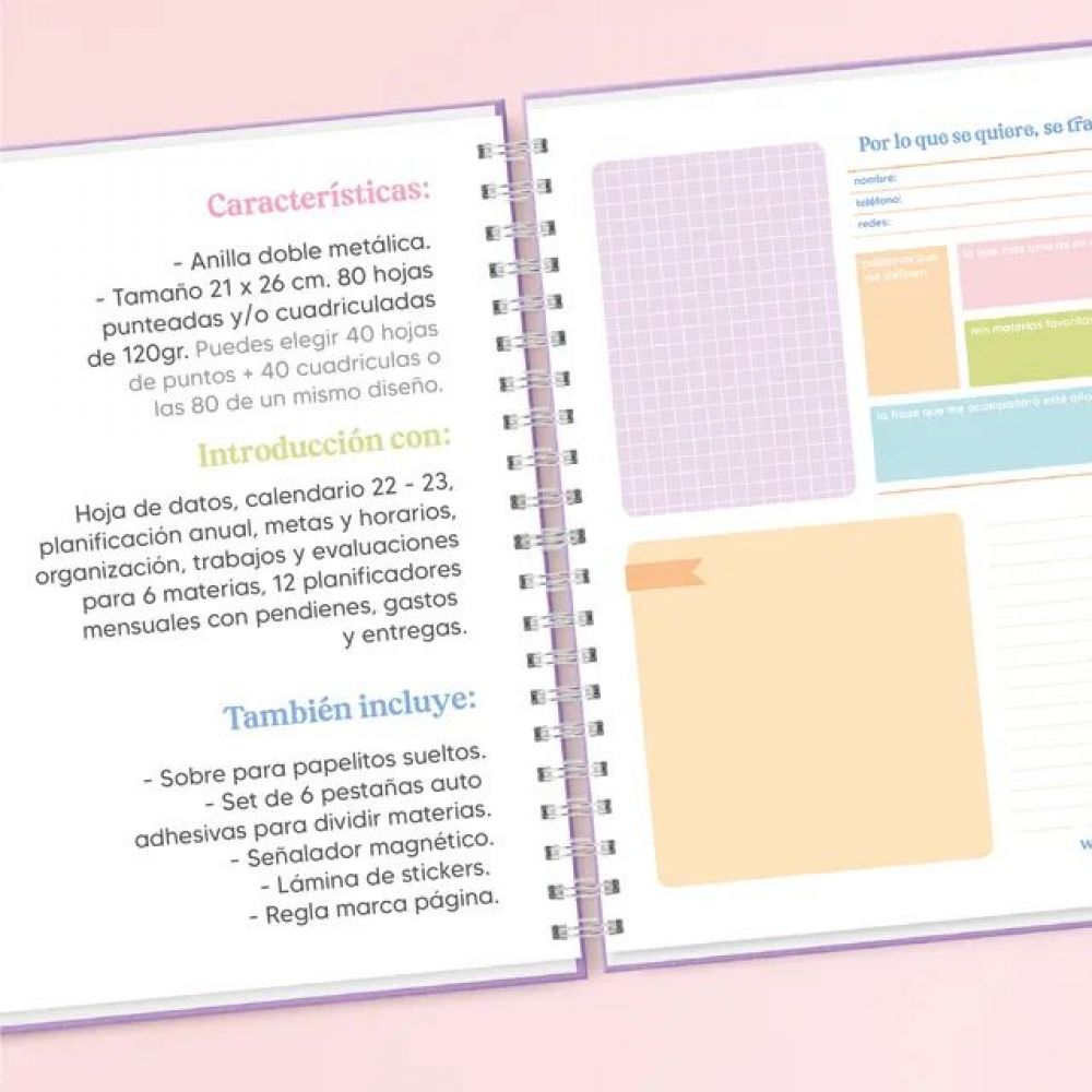 Bs. 120.00Libreta grande perfecta para tus apuntes y materias del cole o universidad, papel super gruesito para que utilices tus materiales favoritos y no trastase nada. Incluye varias secciones de planificación, stickers, marca páginas y señalador magnético.