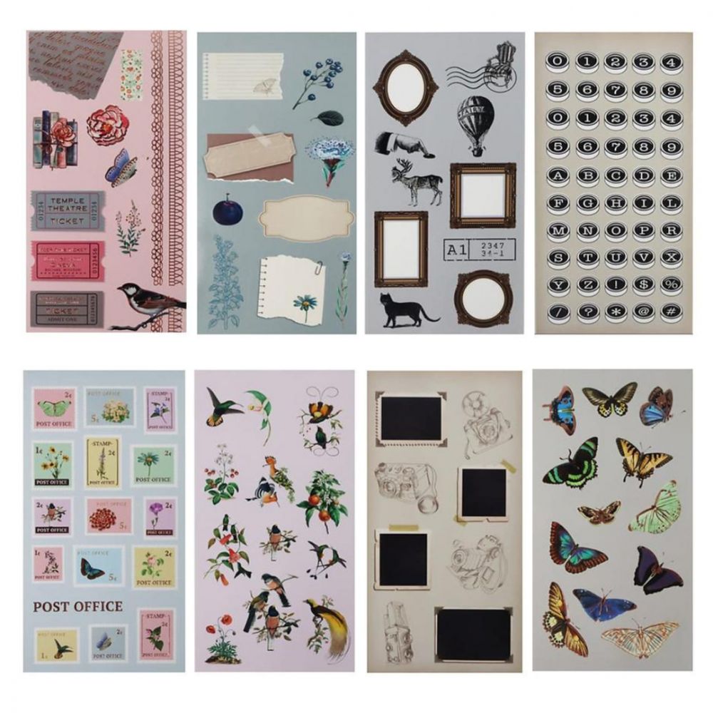 - 400 stickers con temática vintage, que incluyen elementos botánicos, mariposas, flores, papeles añejos, sellos postales y elementos retro que llenaran de aires nostálgicos todos tus proyectos.