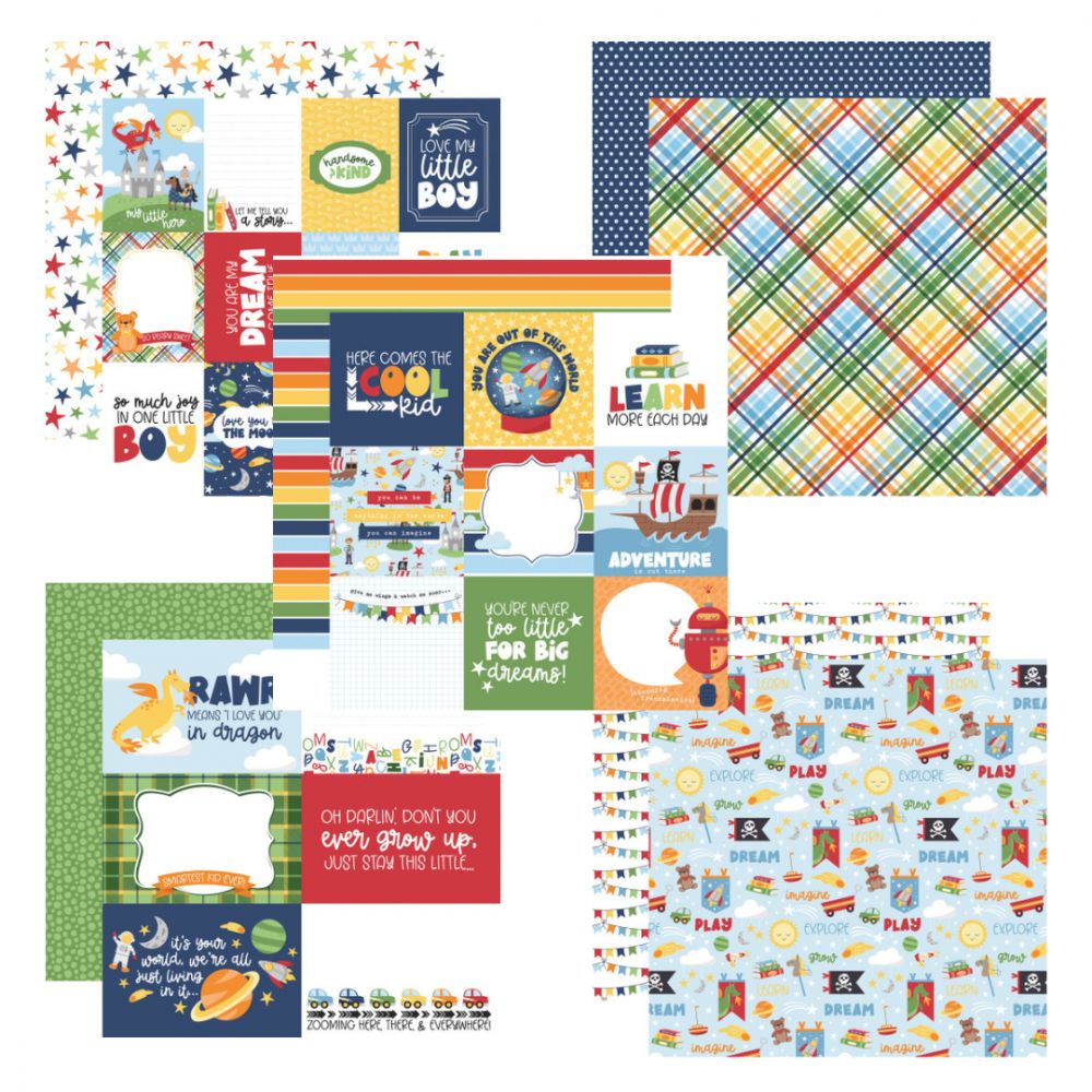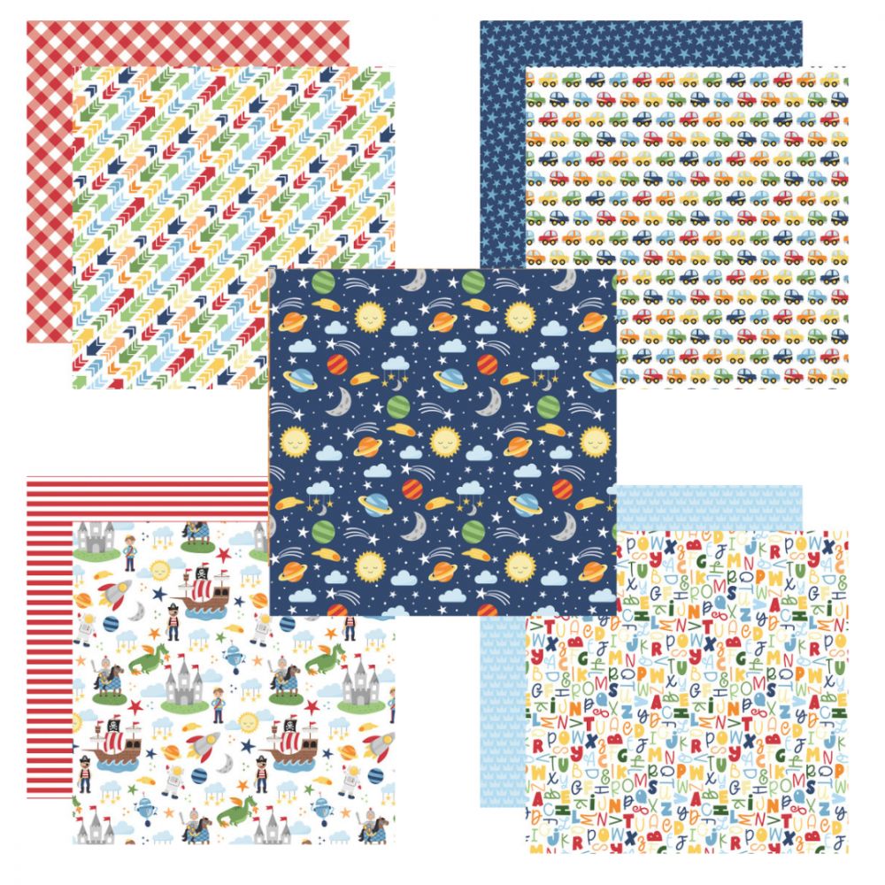 Doce papeles de doble cara de 12" x 12" que presentan diseños únicos en cada lado.