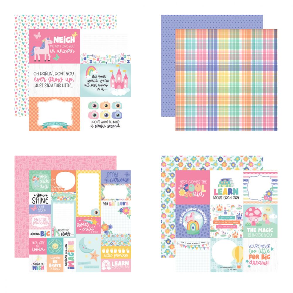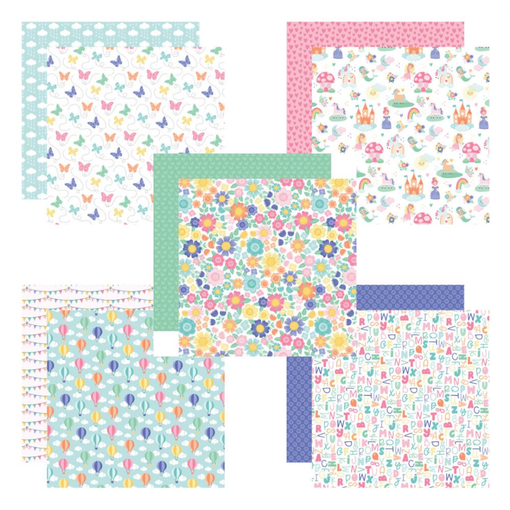 Doce papeles de doble cara de 12" x 12" que presentan diseños únicos en cada lado.