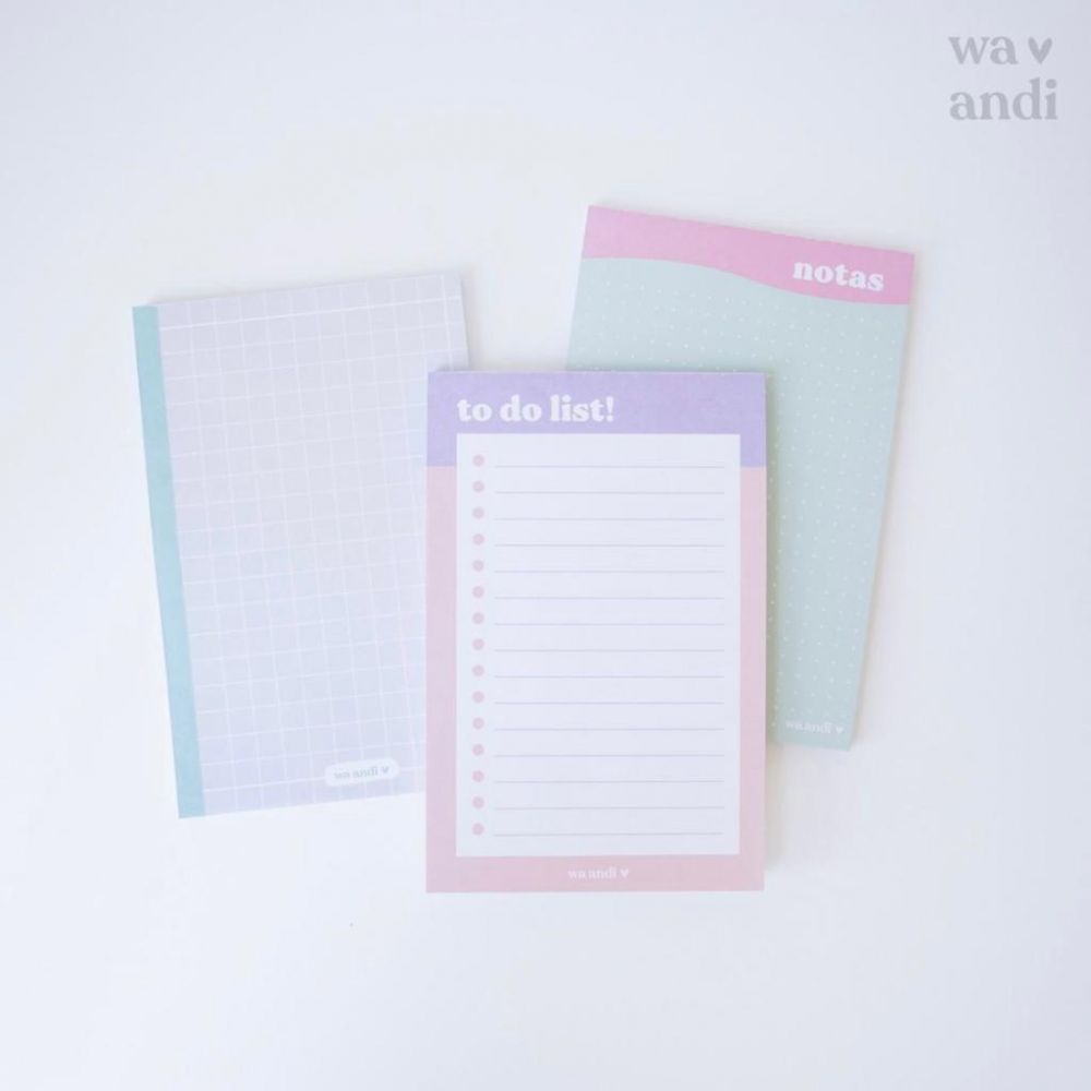 3 blocs medianos para planificar, cada uno mide 10,5 x 16 cm e incluye 55 hojas de 90 gr impresas full color a una sola cara.
