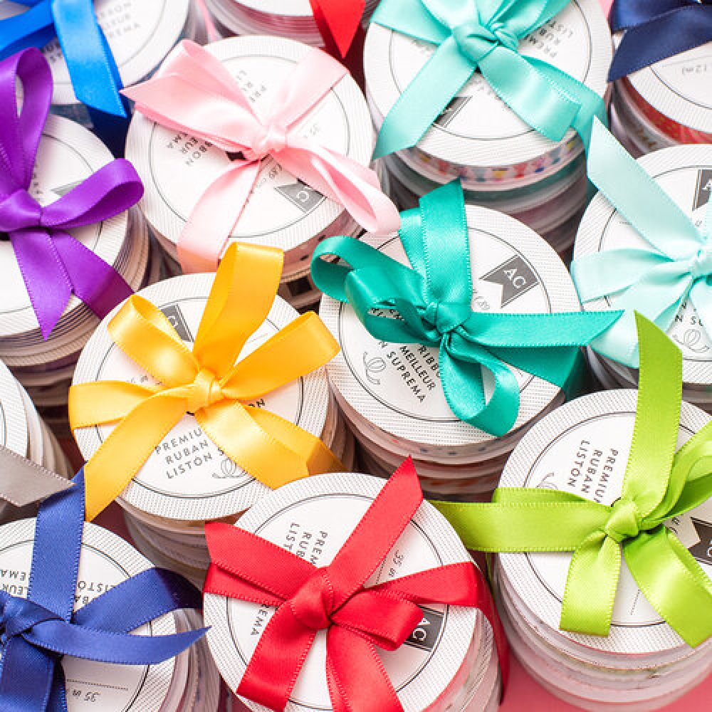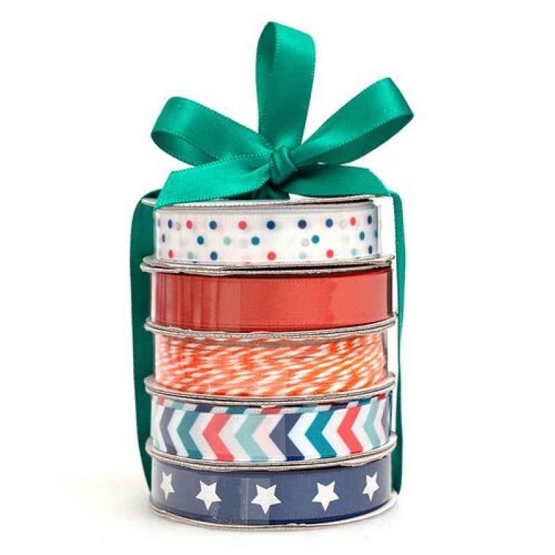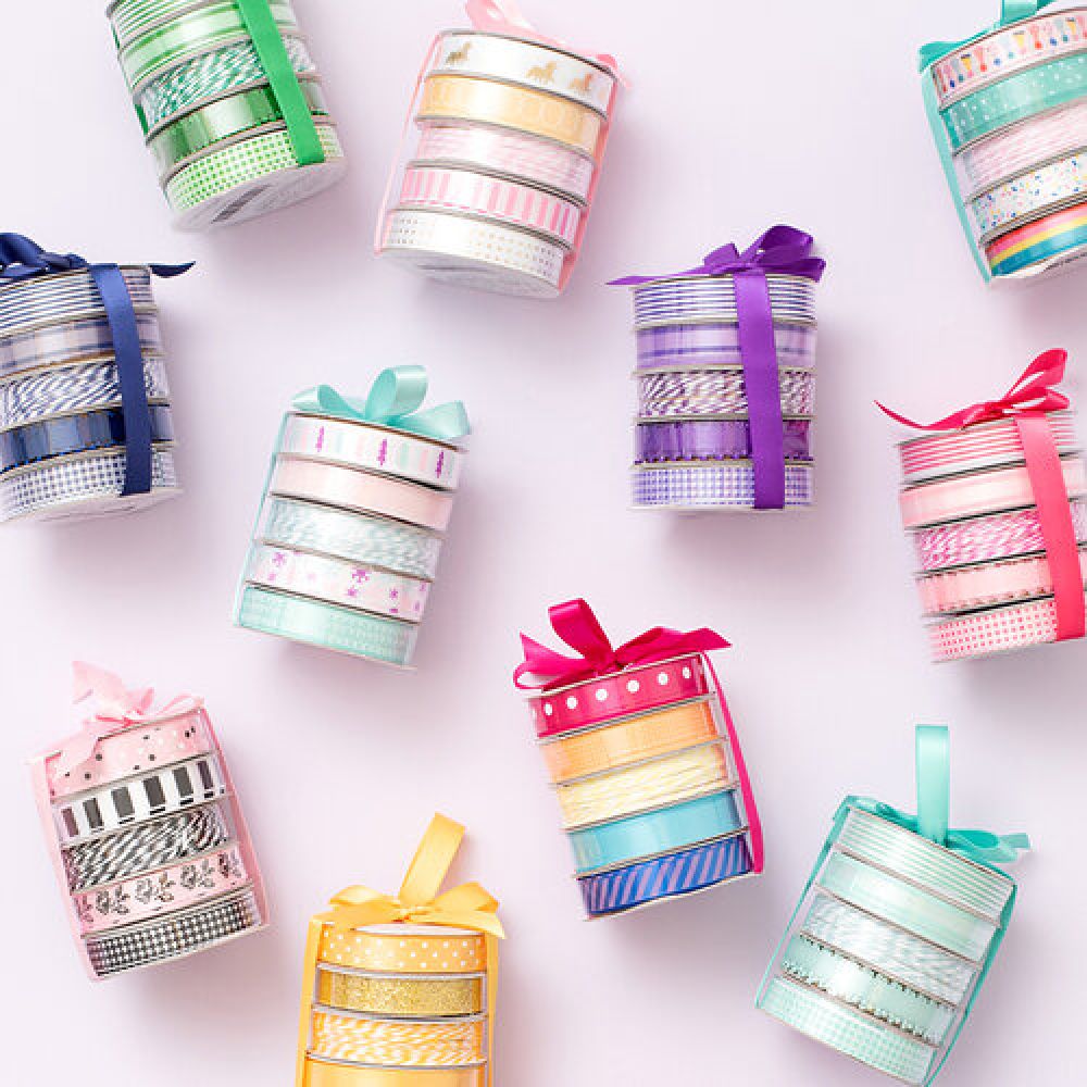 Los cuatro carretes de cinta miden 0.9 cm x 1.2 m y el cordel del panadero mide 2.45 m.