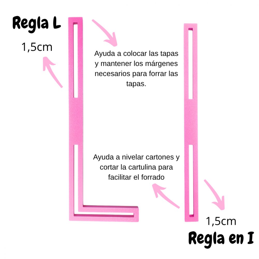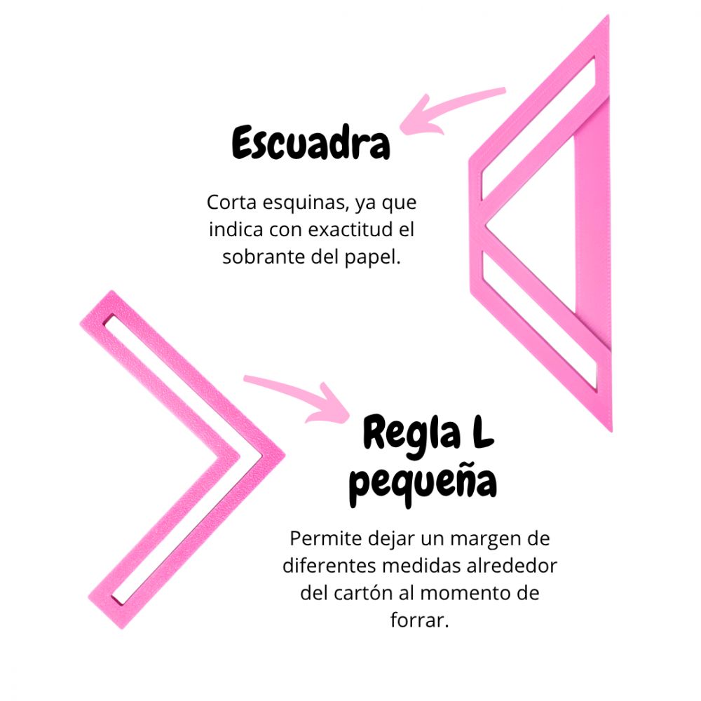 - Regla en L: Ayuda a colocar las tapas y mantener los márgenes necesarios para forrar las tapas.