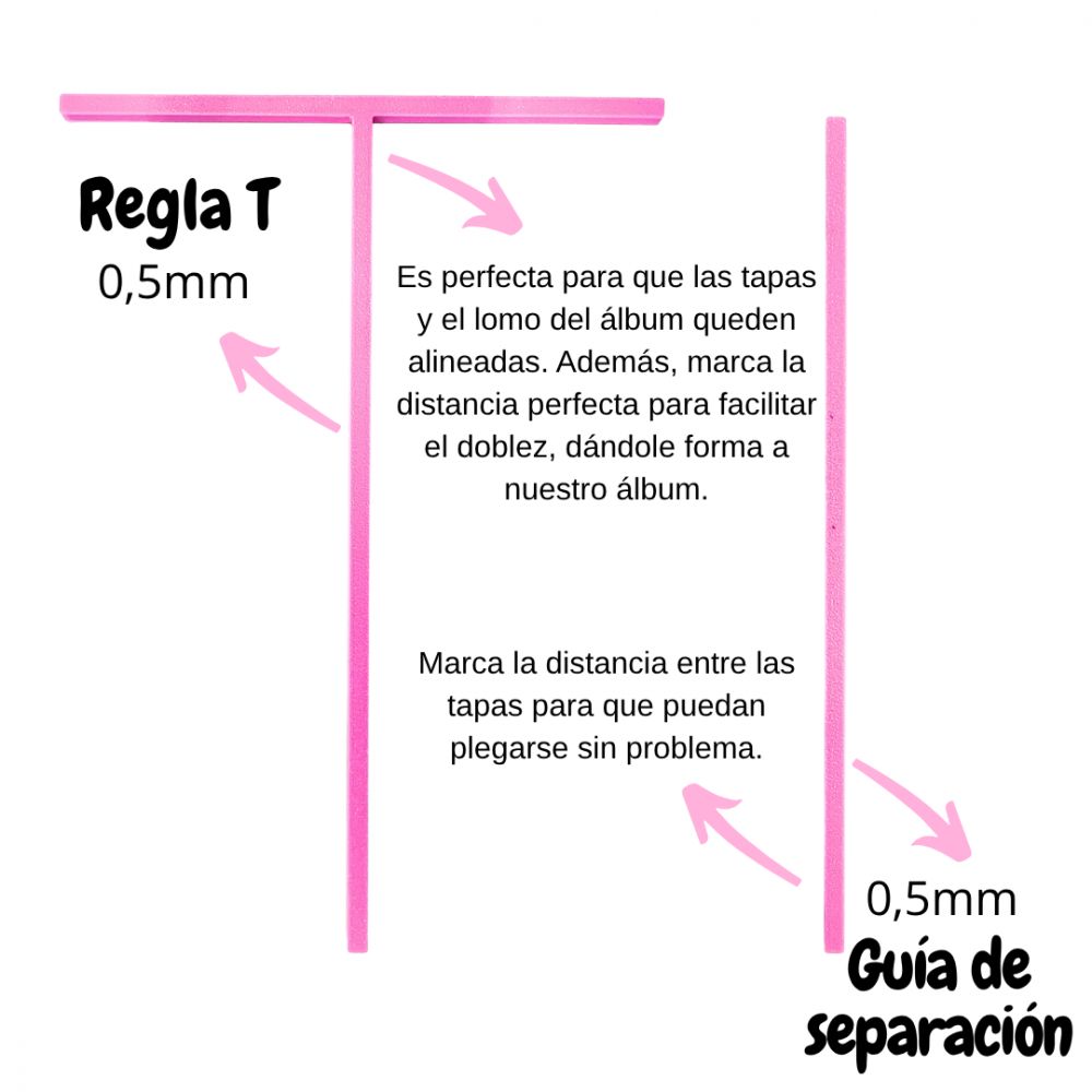 - Regla en T grande: Es perfecta para que las tapas y el lomo del álbum queden alineadas. Además, marca la distancia perfecta para facilitar el doblez, dándole forma a nuestro álbum.