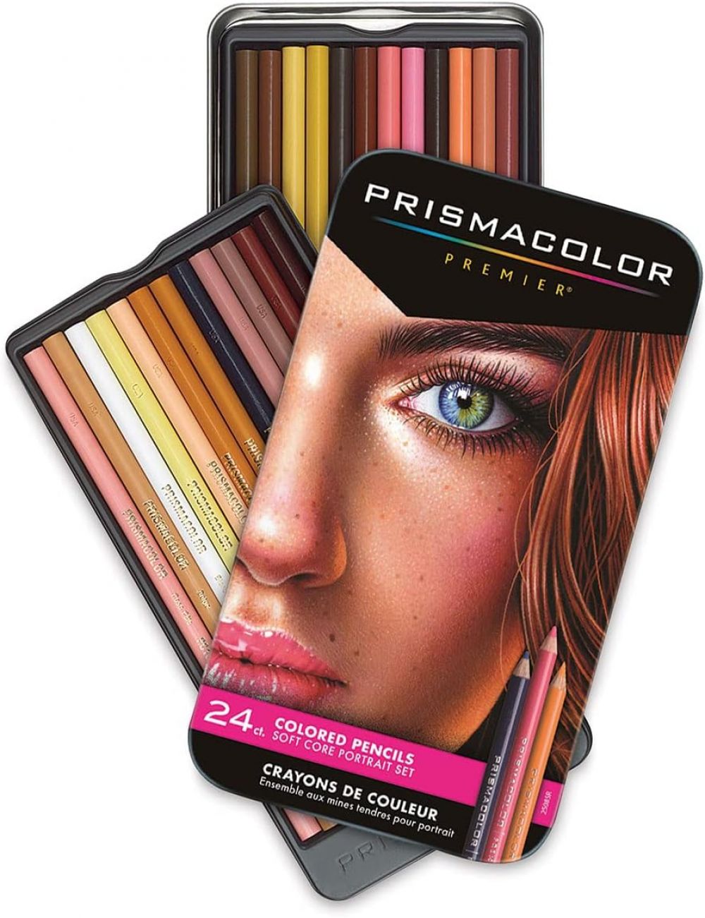 Estuche metálico con 24 lápices de colores seleccionados especificamente para obras de arte de retratos.
