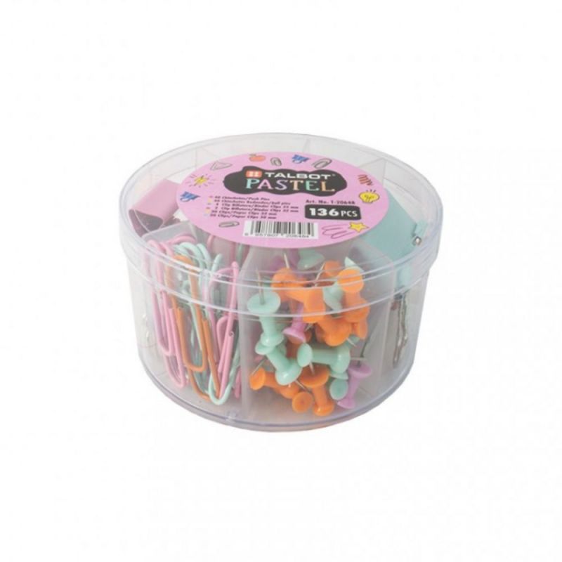 Set, Talbot Colors Pastel, Chinchetas, Ligas y Clips, Caja Plastica Circular