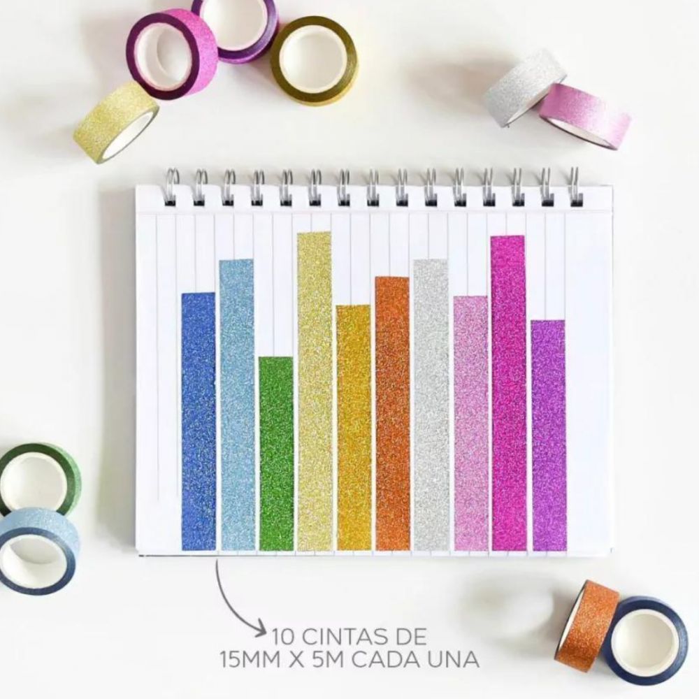 - Su pegamento es de la más alta calidad y no deja residuos ni daña las superficies cuando se retira. ¡Contiene diez cintas de 15 mm x 5 m con mucho brillo y belleza!