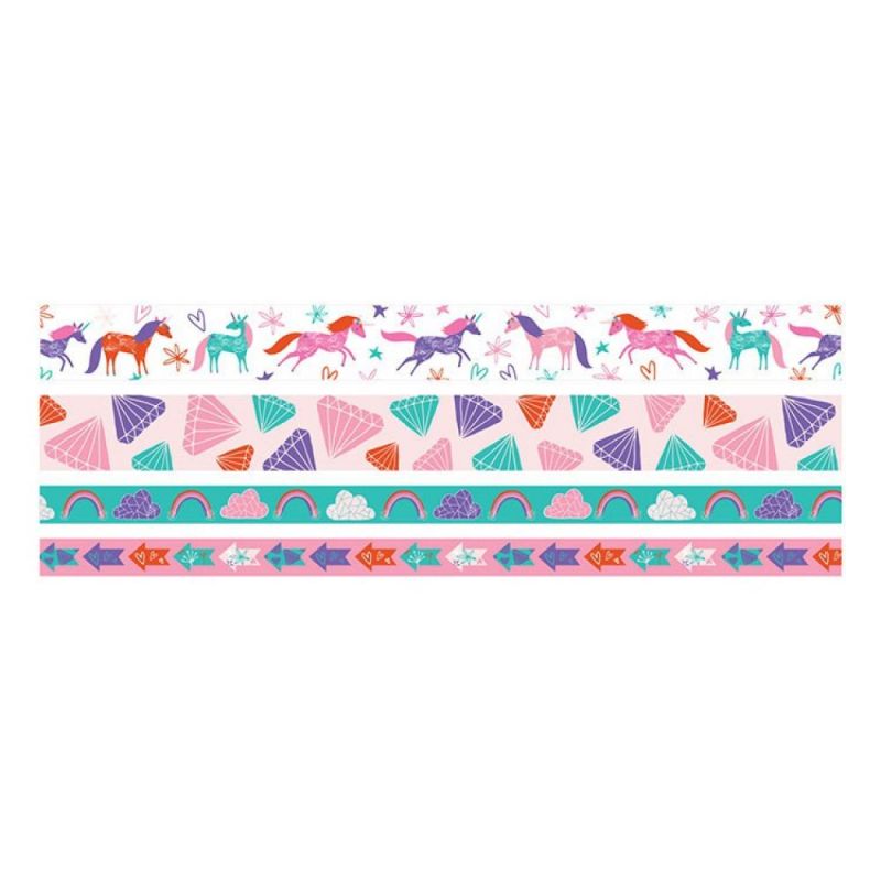 El paquete incluye 4 rollos de cinta washi de 5.5 mde largo cada uno. Dos rollos tienen 1.3 cm de ancho y los otros dos tienen 0.65 cm de ancho..
